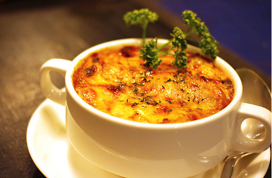 洋蔥湯:從羅馬時代開始風行,可能最能代表法國湯的就是洋蔥湯了,一般作為前菜呈現(xiàn)。湯的表面有一層奶酪形成的殼,內部除了切碎后煨過的洋蔥還經常有煮軟的面包。
