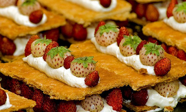 7.拿破侖千層酥:也是一種傳統(tǒng)甜品,幾層酥皮和幾層奶油疊合起來(lái),頂上用白糖和巧克力做出大理石紋理。