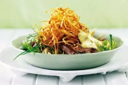 13.蛋黃醬牛排及紅薯絲:“Béarnaise”是一種類(lèi)似于蛋黃醬的醬料,可以用作烤牛排和炸紅薯絲的調(diào)料,讓它們變成法國(guó)小酒館里的一道經(jīng)典菜——牛排薯?xiàng)l(steak frites)。