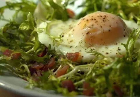 16.碎肉片沙拉:這種沙拉類(lèi)似于里昂沙拉,不過(guò)它的味道更淡一些,因?yàn)樗褂玫娜馐羌幽么笈喔W龊蒙忱?,在每個(gè)盤(pán)子上再放上一個(gè)水煮蛋??梢杂米鞑颓伴_(kāi)胃沙拉,也可以用作午餐。