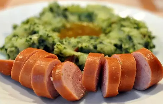 土豆泥配烤香腸:我覺得再難找出像荷蘭人一樣熱衷于把土豆當(dāng)主食的國家了。出生于荷蘭的畫家梵高不是有幅名畫就叫“吃土豆的人”嗎。荷蘭人會(huì)把綠色蔬菜,如甘藍(lán)菜或菠菜,和煮熟的土豆放在一起攪拌,再加點(diǎn)鹽或橄欖油調(diào)味,這就是荷蘭人晚餐的一道主食了??赡芤?yàn)镸issJoy不是個(gè)香腸愛好者,對于這盤子里的香腸自是給不出如“很贊…美味…好好吃”的評價(jià)了。