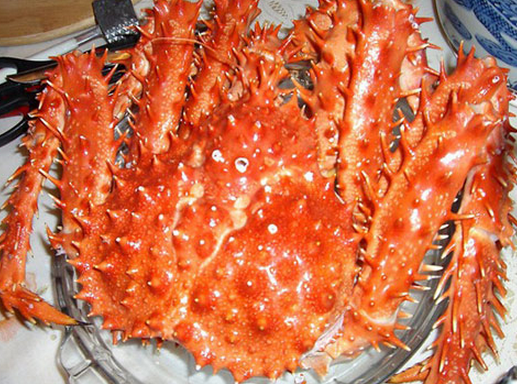 皇帝蟹:所謂皇帝蟹是指蟹的肥大,大的皇帝蟹足有面盆大,看著就讓人垂涎欲滴,有人甚至將皇帝蟹殼帶回國作紀念的。另外皇帝蟹是海鮮中的上品,是蟹中之皇,一般重量平均在2公斤到5公斤,要生長十年左右才有七八斤重?;实坌敷w積巨大,肥重,甲殼較為堅硬,呈紅黑色膏多肉,蟹肉結實,爽口無比。,多膏多肉,蟹肉結實,爽口無比。大的皇帝蟹足有面盆大,樣子非常威武雄壯,看著就讓人垂涎欲滴?;实坌肺兜栗r美但各部分需要適當料理才會發(fā)揮其美味。尤其是蟹腿和蟹殼。蟹腳是皇帝蟹最鮮美之處,蟹蓋有豐富的膏,但不能和平常吃膏蟹那樣吃。否則覺得膩。其肉鮮味美,營養(yǎng)價值高,是人體獲得所需蛋白質,礦物質和其他維生素微量元素的好途徑。