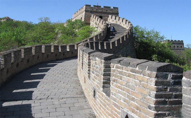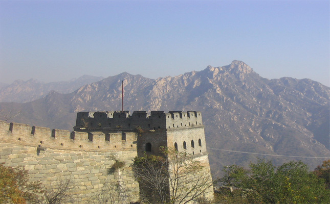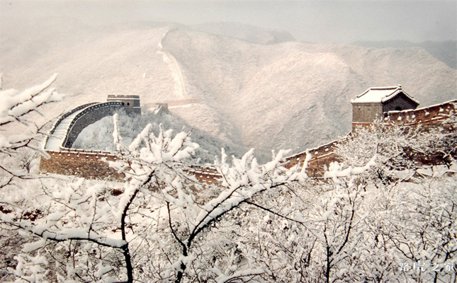 | 長城由山腰直伸山頂,在山頂立一敵樓后,又突然下降,翻身向下返回山腰,又驟然升起,直到海拔940多米的地方,繞了一個大彎,其形狀酷似牛犄角,蒼勁雄渾,人們把它稱之為“牛犄角邊”。長城從“牛犄角邊”繼續(xù)往前延伸,經過一個名叫“箭扣”的地方,這里是已達海拔1044米的山峰,兩側陡峭如削。在修筑長城時,必須從山頭的外側斷崖絕壁上通過,又不能把這個制高點留在外面,使用磚石、木材顯然都不行。于是聰明的能工巧匠們,用了兩根大鐵梁擔在斷崖之上,上面再壘砌磚石,這種方法在整個長城修建史上極為罕見。在慕田峪長城東側,長城本來是順山勢伸向東北??墒堑揭粩硺翘幫蝗环殖黾s1000多米的地段,另辟蹊徑擺向東南方向,山勢盡處,突然終止,在盡頭處修了一個甚是堅固雄偉的敵樓。這段千余米的長城被人們稱之為“禿尾巴邊”。這樣長城在此處就形成了三道長城匯于一樓,“三面極目觀巨龍”的景觀。在慕田峪長城“牛犄角邊”的兩側,有一段長城被稱為稱為“箭扣”及“鷹飛倒仰”。墻體全部建在巖石裸露的懸崖峭壁上,長城的坡度大都在50度左右,其中有一節(jié)接近90度,幾近垂直,臺階僅有幾尺寬,非勇敢者不敢涉足。 |