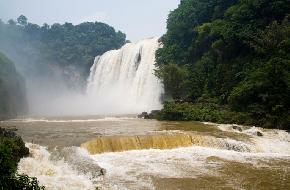 黃果樹(shù)瀑布位于37公里的鎮(zhèn)寧、關(guān)嶺布依族、苗族自治縣的交界處,海拔600-1500米,降雨量1300毫米,風(fēng)光秀麗、奇峰疊起、浩浩蕩蕩的白水河,驟然間由斷崖上跌落,形成九級(jí)瀑布。