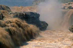 黃河入“壺口”處,湍流急下,激起的水霧,騰空而起,恰似從水底冒出的滾滾濃煙,十數(shù)里外可望。壺口霧氣的大小與季節(jié)、流量有關(guān)。冬季河面封凍,瀑布多成冰凌,地表來水減少,壺口流量降至150—500立方米/秒,激浪不大,飛出槽面水霧極少;夏季流量大增,水流溢出深槽,落差甚小,瀑布消失,不易形成升入高空的濃密水霧;春秋兩季,流量適中,氣溫不高,瀑布落差在20米以上,急流飛濺,形成彌漫在空中的水霧,即“水底冒煙”一景。