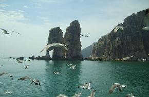【高山島(萬鳥島)】,觀將軍石、姊妹峰、摩天嶺、象鼻洞等海蝕崖壁,環(huán)高山島航行,觀賞海鷗逐帆的壯美景色,喂食海鷗您會看到海鷗圍繞您飛翔的美妙景色。