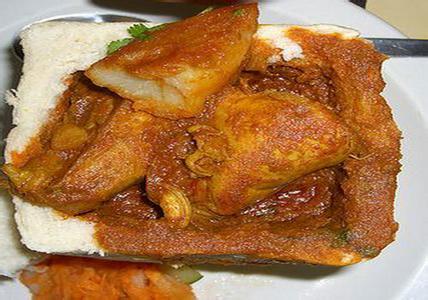 南非三明治 另一種反映南非文化多元性的菜肴是著名的南非三明治,它在德班印度后裔的群落中尤其受到歡迎。也許它被認(rèn)為是一種快餐食品,畢竟它制作迅速而且不是健康食品(但很美味),南非三明治就是由一塊半邊鏤空的面包中間填上任何你喜歡的東西組成。我們喜歡熱辣辣的咖喱燒,你呢?
